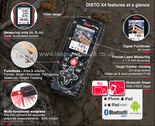 Leica DISTO X4 , sağlam bir dış mekan lazer mesafe ölçer ve Leica Geosystems’ın en son X serisi lazer mesafe ölçerlerinin bir parçasıdır. Sağlam kauçuk bir gövdeye sahip olan bu cihaz gerçekten sağlamdır, su geçirmezdir ve 2 m’ye kadar düşme testinden geçmiştir, en zorlu şantiye koşullarına dayanacak şekilde tasarlanmıştır. Bluetooth özelliği, Leica’nın ÜCRETSİZ Uygulamalarıyla birleştiğinde, tüm ölçümlerinizi dijital iş akışınıza dahil etmenizi kolaylaştırır, zamandan tasarruf sağlar ve hatalardan kaçınır.